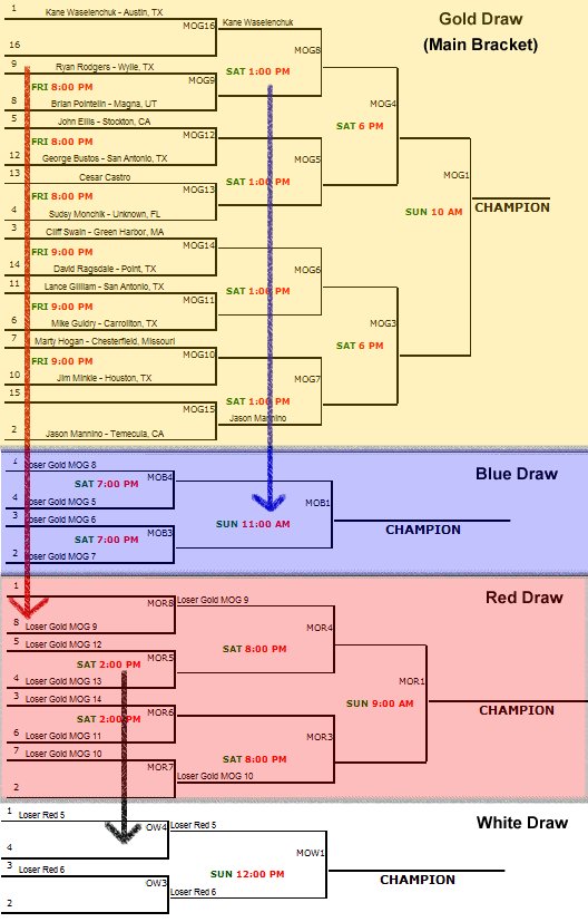 Teams losing in the first round of the gold draw drop into a separate red bracket to compete for 9th – 12th place.